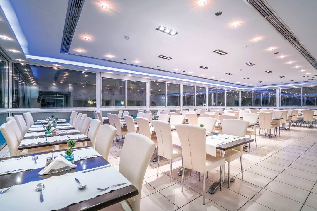 The restaurant effortlessly blends international dishes and Greek favourites. At the bar, you can fill up on snacks between meals.