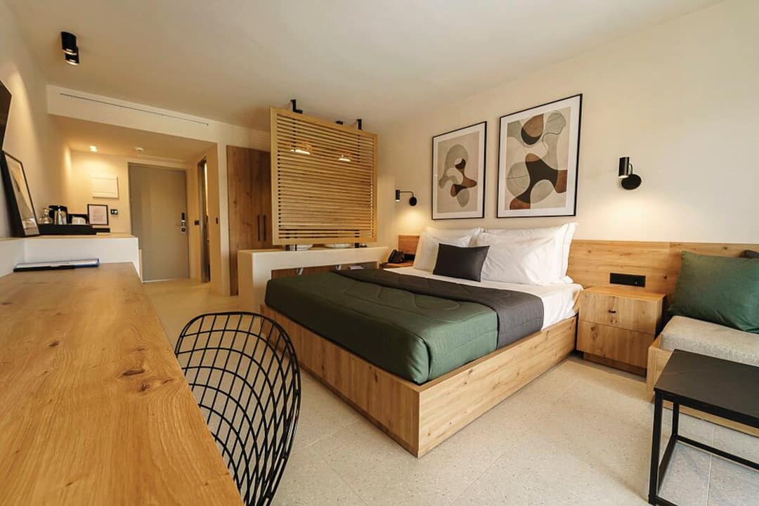 Everything about the hotel is contemporary – think white, minimalist-style interiors and bedrooms with bright accents. Outside, two pools are sunk into the terrace. One’s even paired with a bar where you can sip drinks and enjoy mountain views.