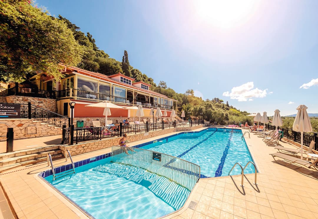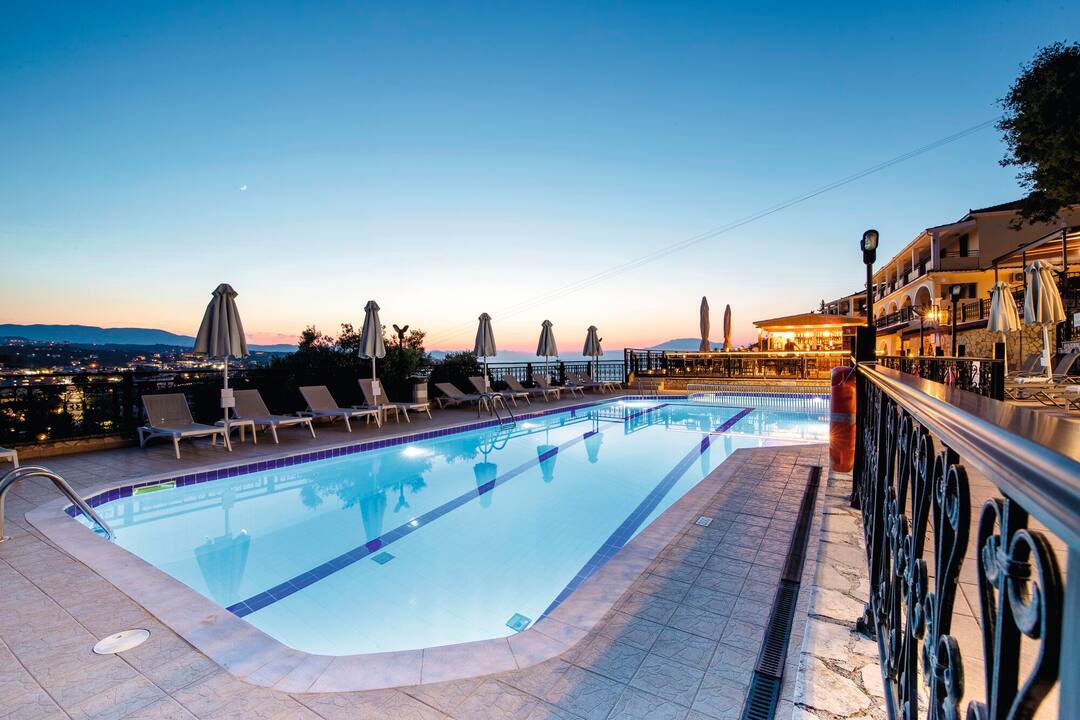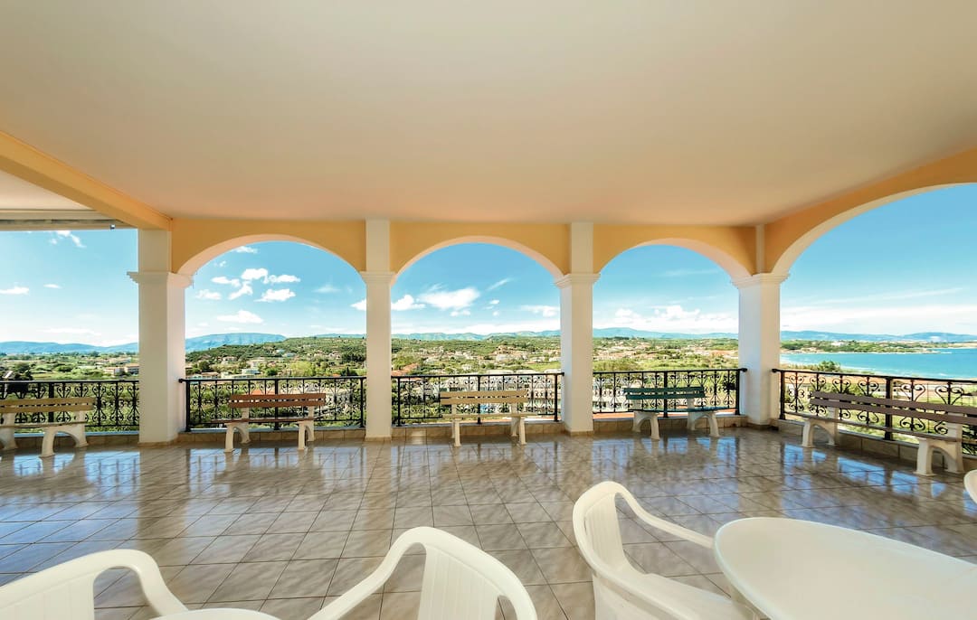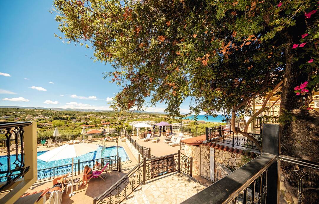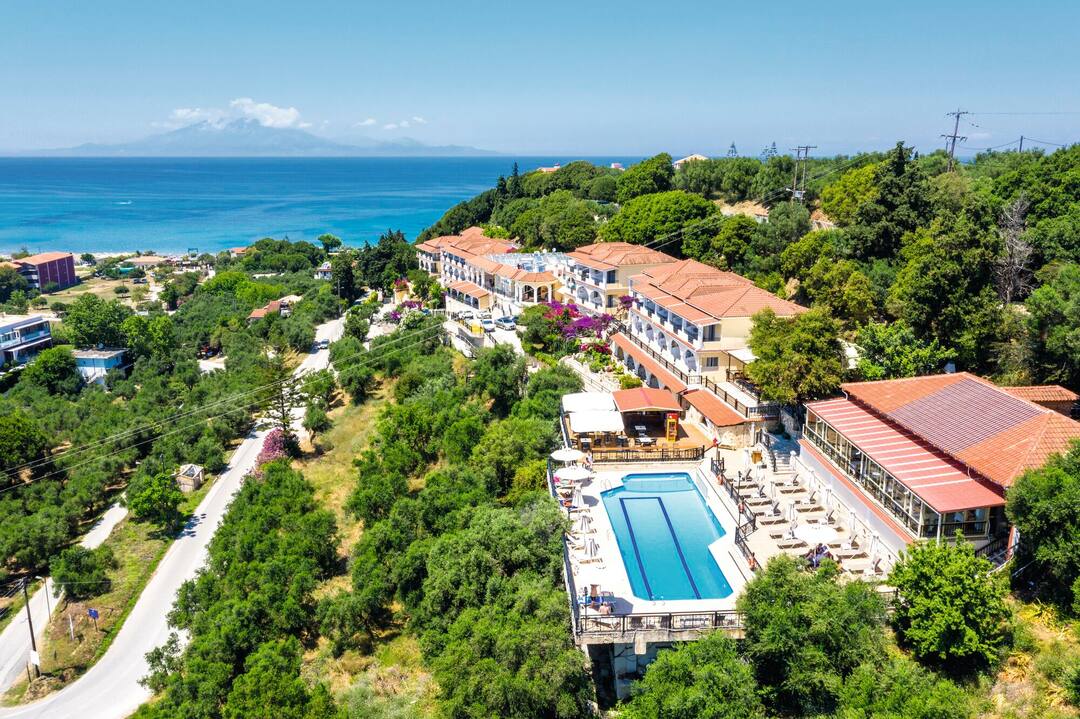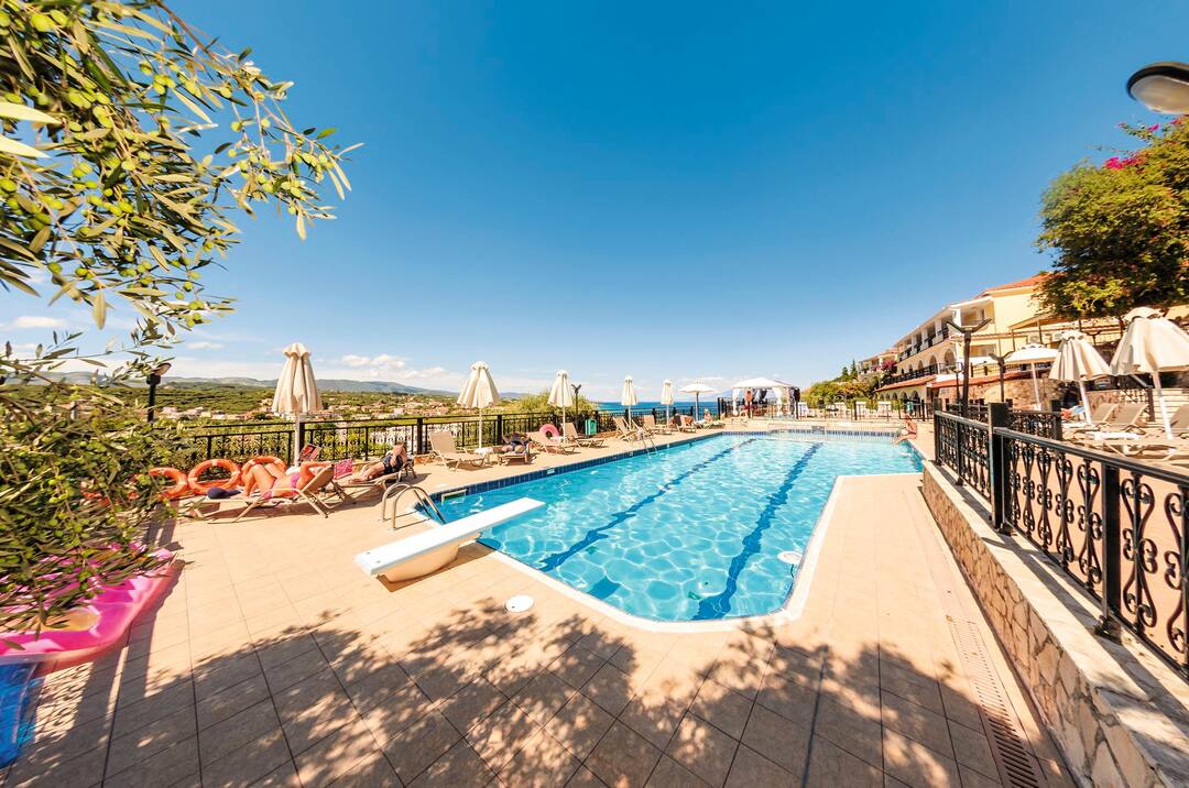 The Zante Palace is perched on a hill. As a result, it combines knockout sea views with a near-the-action location.