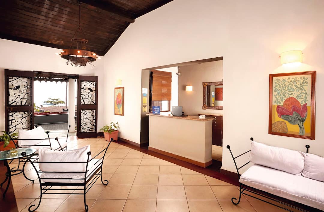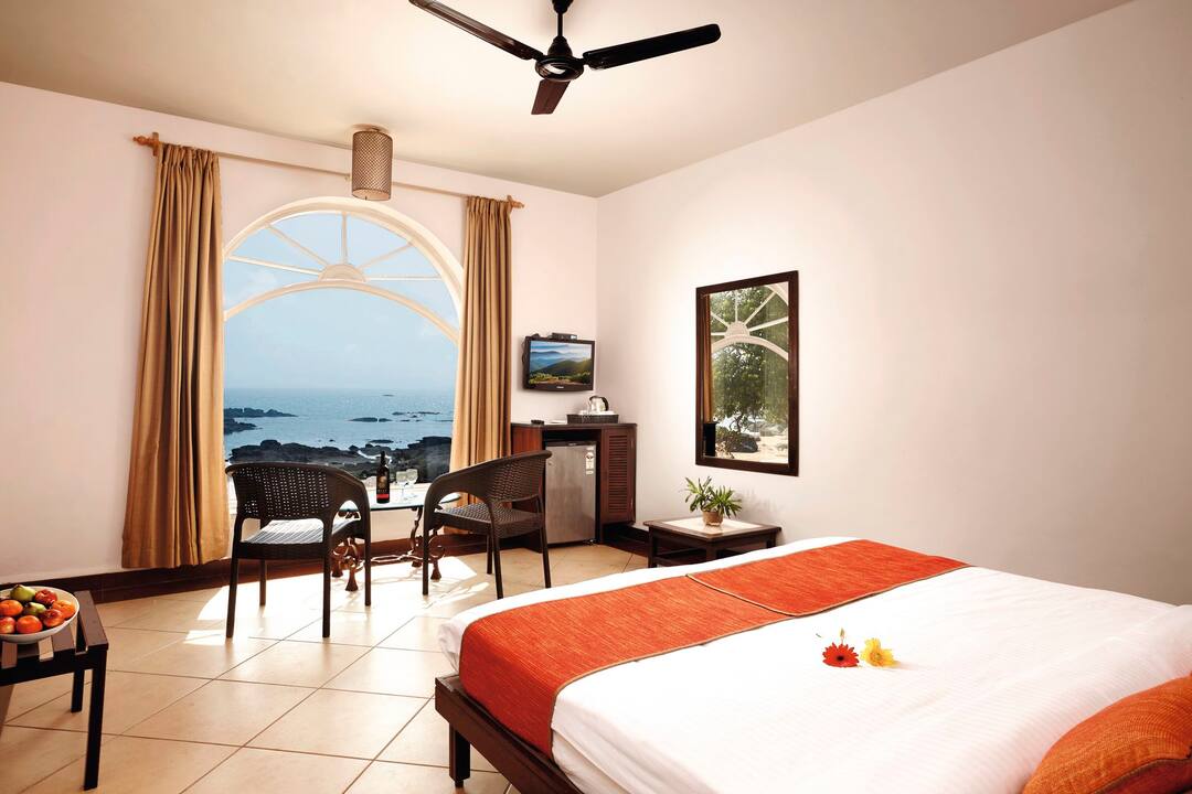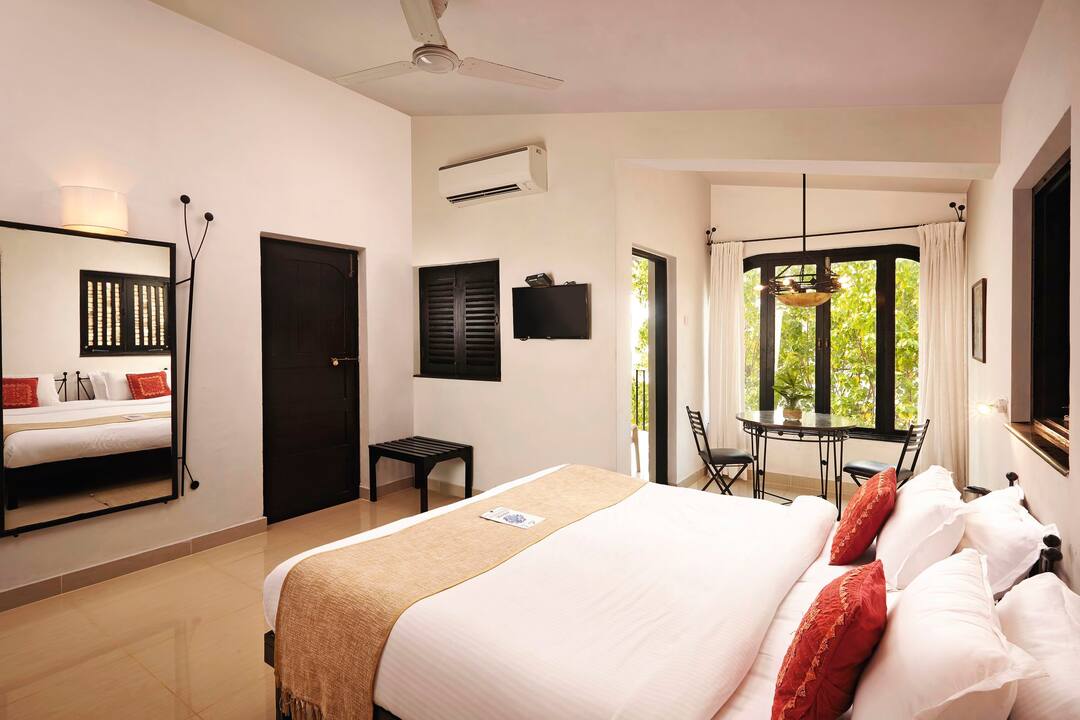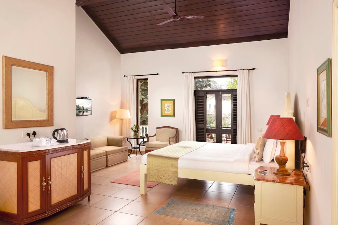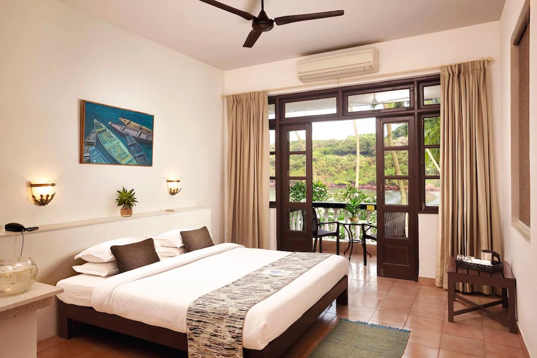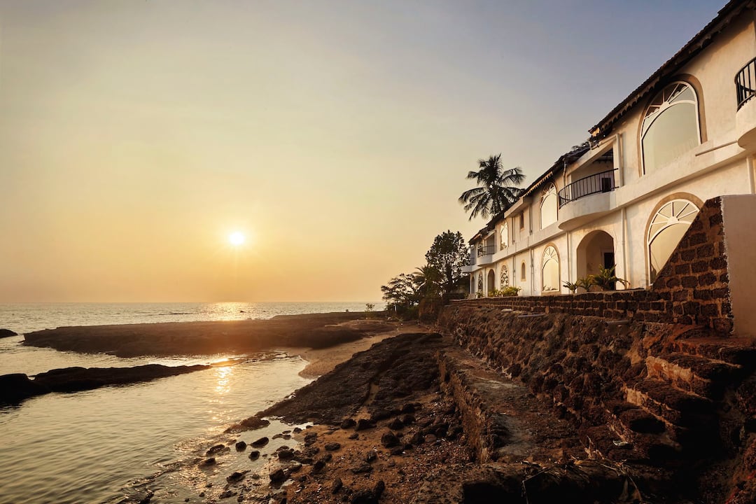 The O Pescador Hotel peeks out from a blanket of palm trees on Goa’s beach-brushed coastline. There’s a sleepy beach on one side and a rocky viewpoint on the other. Colonial-style buildings are pushed right up against the waterfront, and for an extra splash of luxury, every room has a sea view.
