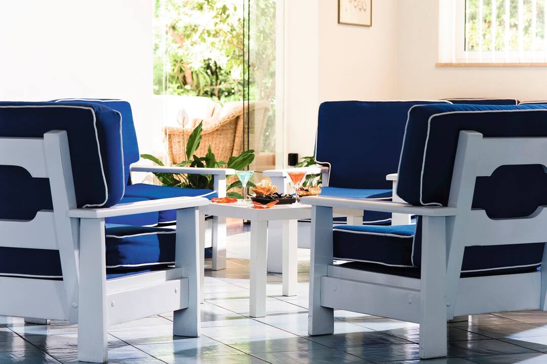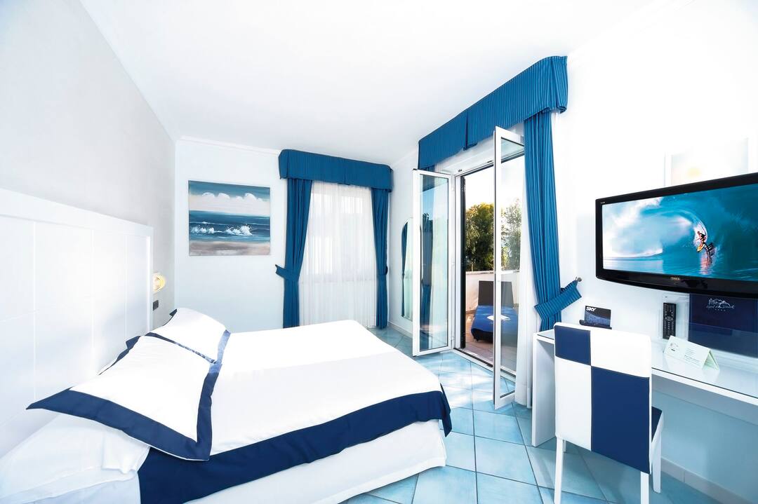 There’s a real seaside feel to the Hotel Villa Durrueli Resort and Spa. The pool’s in a sunny spot, and in your room, you’ll have a nautical theme in blue and white.