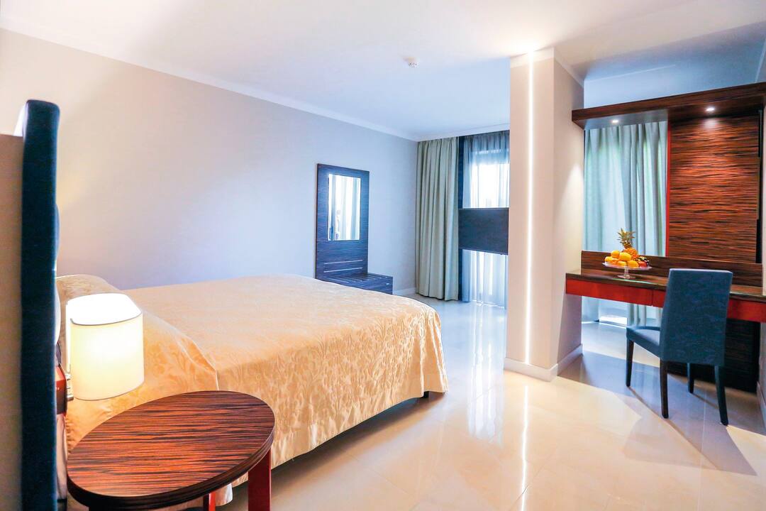 Outside, curvy sunloungers surround the pool. It’s set in flower-lined gardens and comes with impressive views of the Mediterranean Sea.