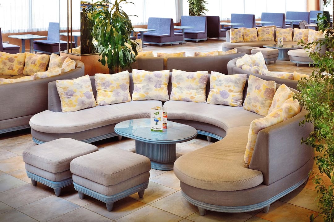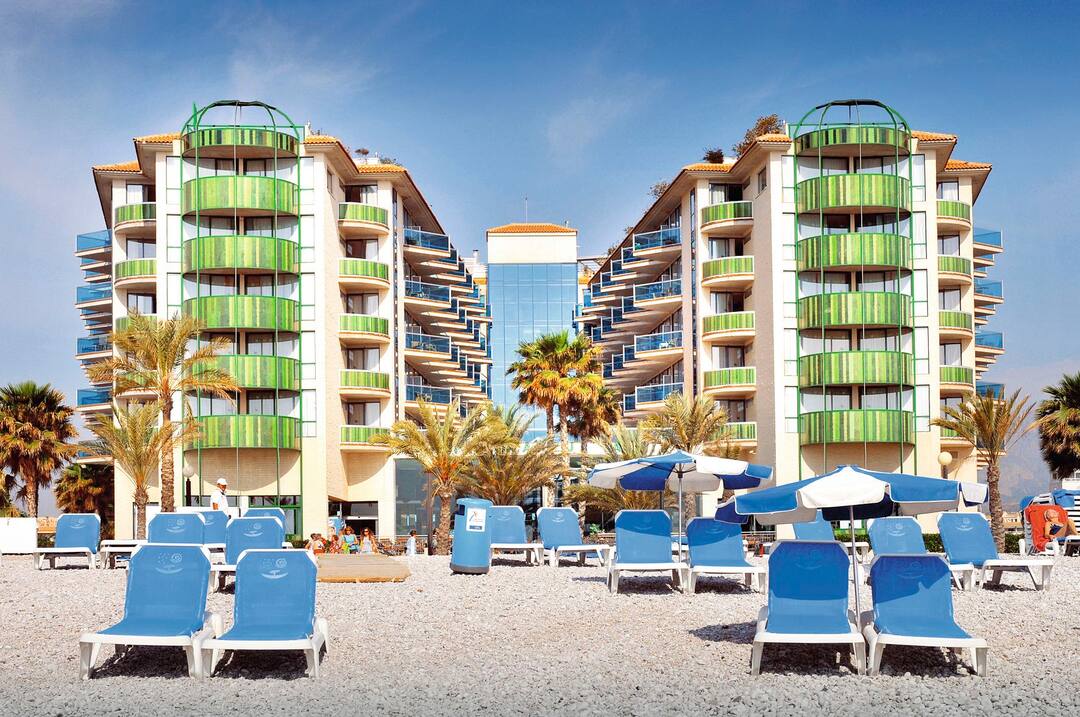 The rooms at this U-shaped hotel come with blue-tinted balconies. Most of them also come with a sea view. The decor is simple and stylish in the rooms, with a neutral colour palette coupled with framed wall art and floral-design chairs.