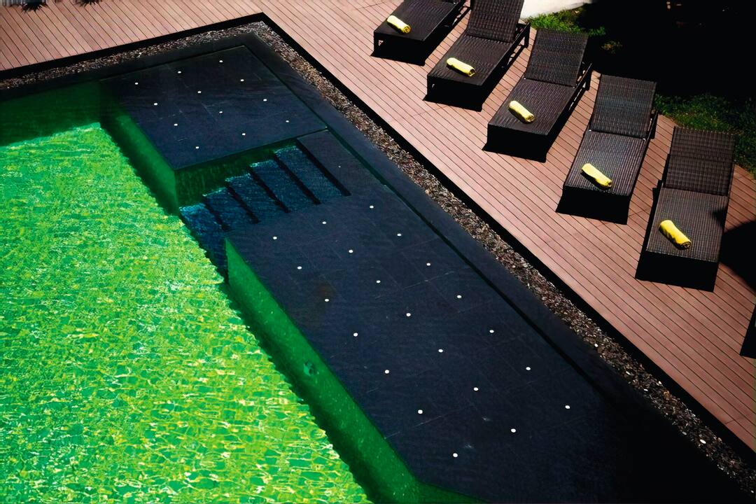 Of the two pools, one’s a turquoise collection of interlinked smaller pools, and the other’s an emerald-coloured spa pool edged by daybeds.