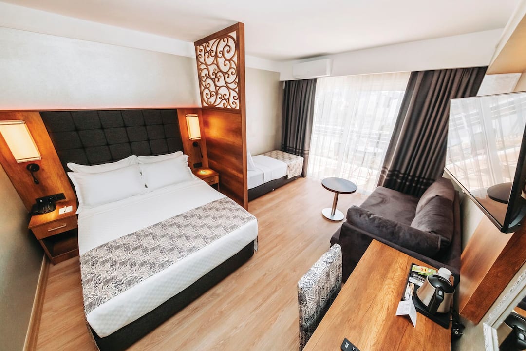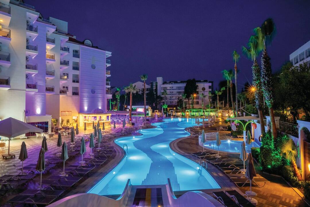 When you stay at the Ideal Premium, you’re right in the heart of the action. The hotel is only metres away from the sand-and-shale beach, and is even closer to the nearest shops and restaurants. In other words, everything you need to enjoy your holiday is right on your doorstep. At the hotel, the large outdoor pool comes complete with a water slide, while there’s also a kids’ pool and a sun terrace with loungers and parasols. You’ll also be spoilt for choice for food. Visitors rave about the main buffet restaurant, but there’s also a pool bar, a snack bar, a lobby bar and a patisserie to keep your hunger at bay during the day.