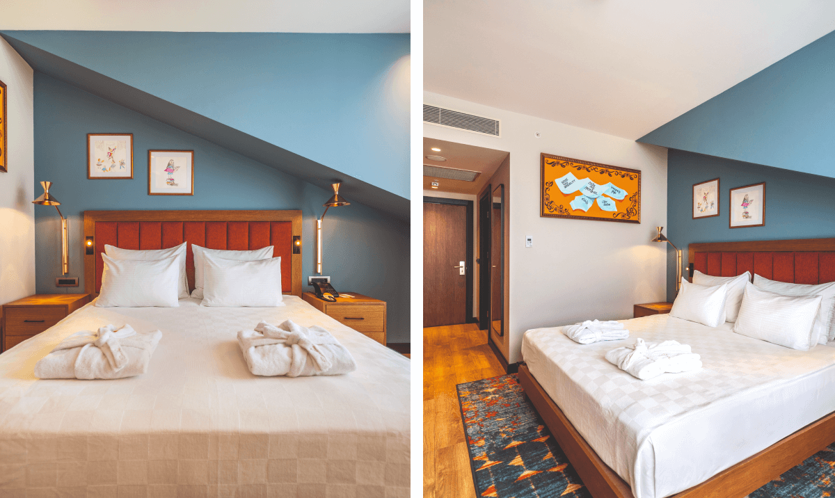 This place has a handful of pools, including a lagoon-like dipping spot and an indoor pool with some hot tubs. Plus, there’s a smaller option with a trio of waterslides for little splashers. Villa guests even have their own access to a private pool and bar! Other rooms come in the way of double or family rooms, or family and junior suites.