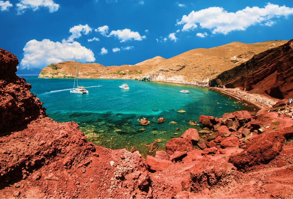 Santorini’s beaches aren’t your average white sanded shores, but this doesn’t mean that they’re any less picturesque. Located just minutes away from the ancient site of Akrotiri, this unique coloured backdrop is one of Greece’s most distinctive beaches with its red and black volcanic coated shoreline.