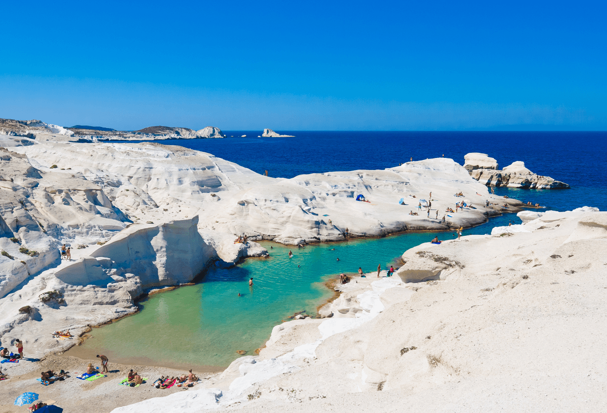 This all-white beach is located in the north of Milos and is one of Greece’s biggest draws. The white rock that sits between the rippling water is one of the most unique backdrops you may ever witness, so don’t miss out!