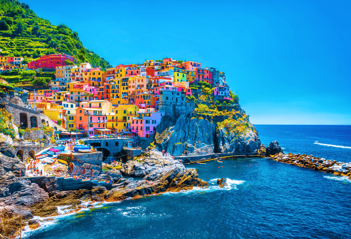 Cinque Terre is nestled on the Italian Riviera and is a string of centuries-old seaside villages. In each of the five towns, you can find a distinct array of colourful houses and vineyards clinging to steep terraces. The towns are Riomaggiore, Manarola, Corniglia, Monterosso al Mare and Vernazza