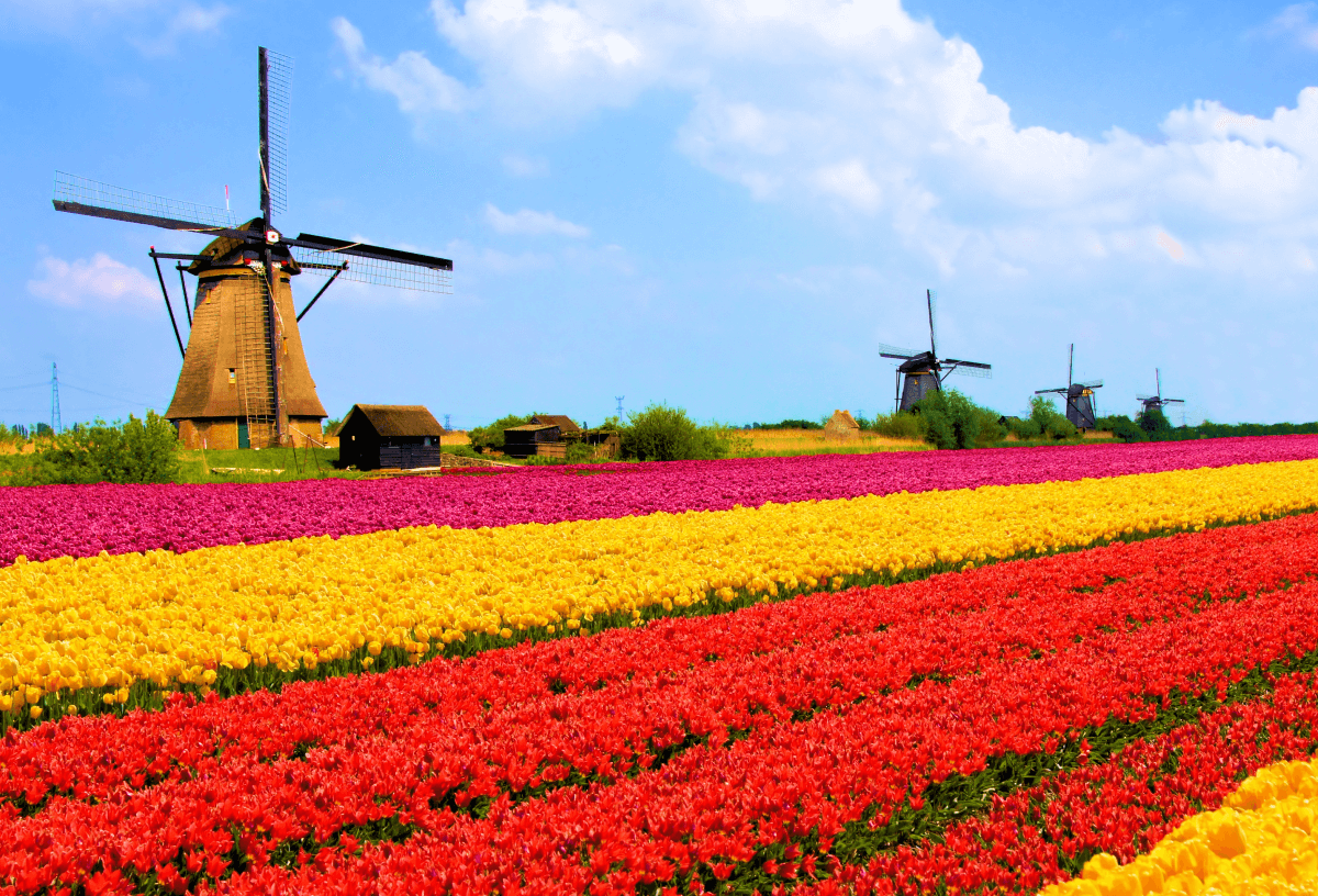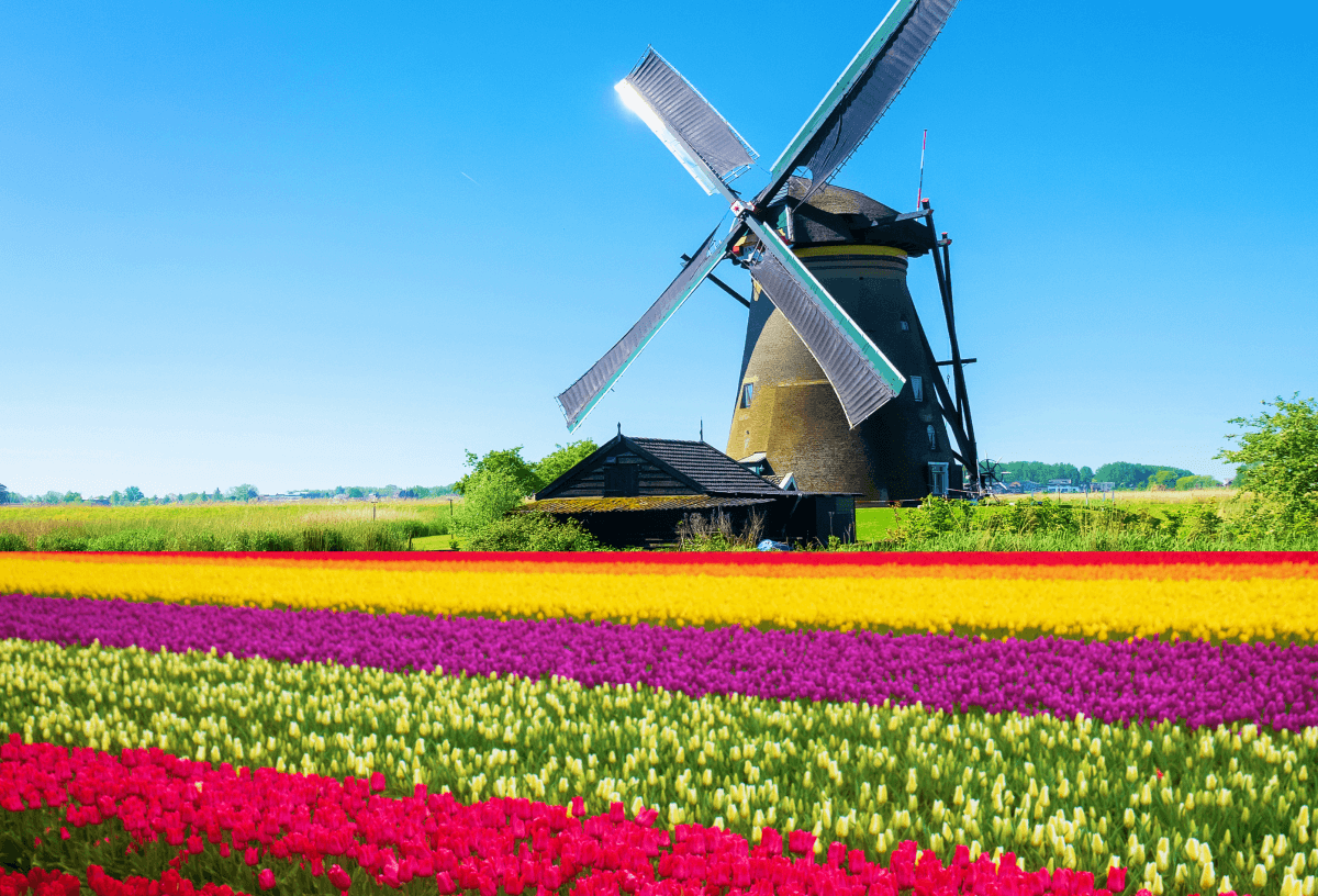 One of the most iconic sights of Amsterdam is the seemingly endless fields of brightly coloured tulips. Each row is planted with bulbs of a different coloured petal, creating a stunning rainbow sea of flowers in the fields.