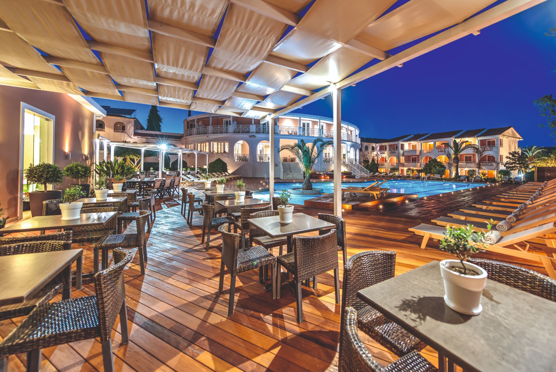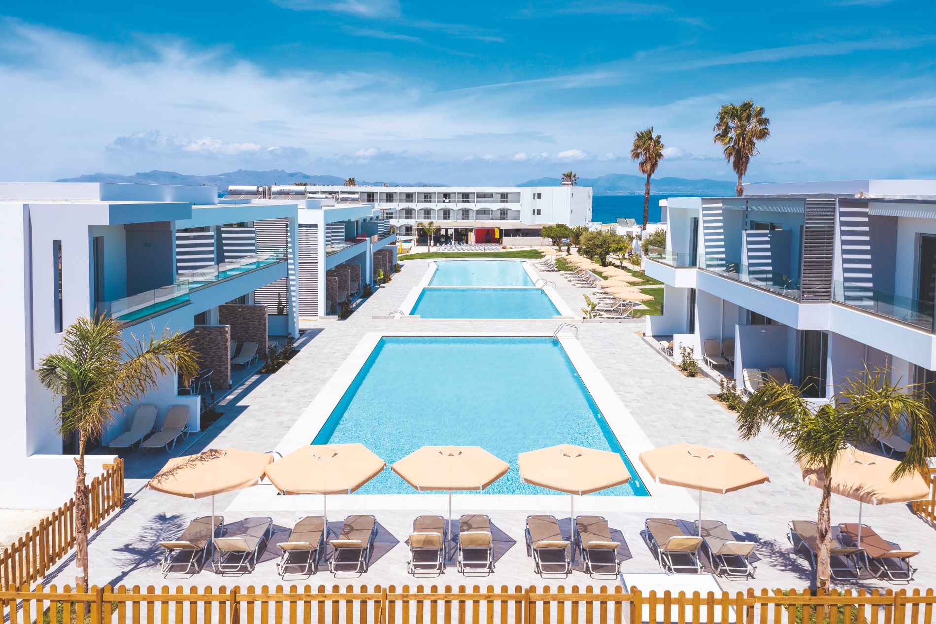 The all-inclusive Bitzaro Palace Hotel is in the perfect spot, just five minutes away from Kalamaki’s strip.