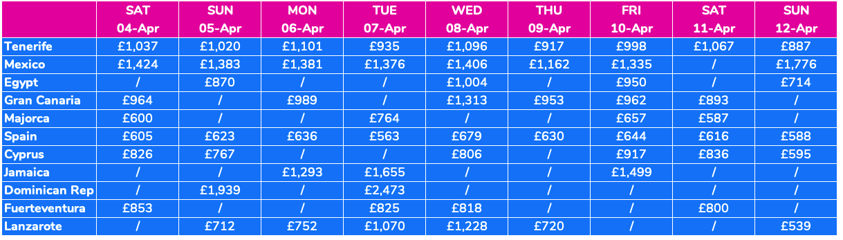 Here’s how average prices compare for 4* seven-night all-inclusive holidays for a family of four flying from London for every possible start date over the Easter school holiday.