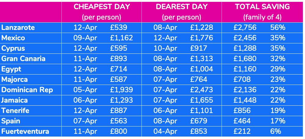 As schools have a two-week break over Easter, you can be flexible on your departure day and still get back in time for the start of the spring term – so by moving your flights by a few days you can find big savings on your holiday costs.