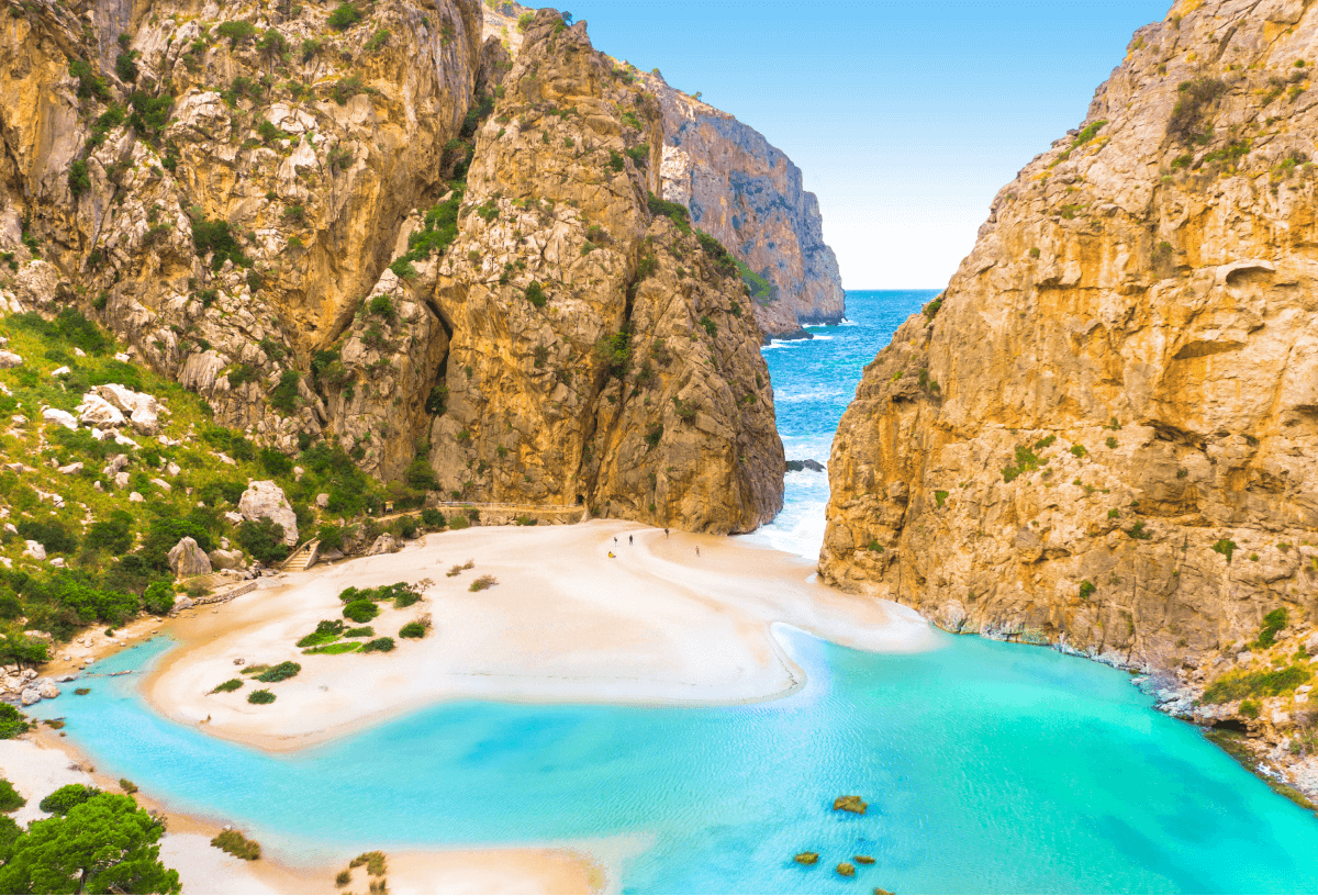 As you walk along the water’s edge you’ll notice how crystal clear the water is, before getting a sneak peak of the hidden beach just around the corner. Sa Calobra beach is a part pebble, part sand beach located at the end of a gorge, and you’ll find yourself walking through a short tunnel that’s been carved out of the cliff to get to it.