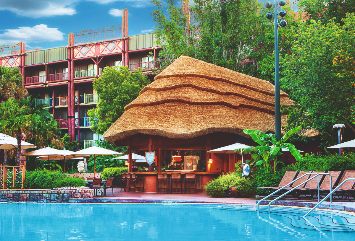 When you’re not exploring the Disney and Universal parks, there’s lots to keep you entertained at the hotel. there’s a games arcade and a playground, plus drumming and singing sessions in the lobby. You can also pick up one of the hotel’s wildlife-spotting guides, and start ticking off different species in the surrounding savannah. As well as the giraffes and zebras, there are African flamingos, white-bearded wildebeest and impala. If you fancy a dip in cooling waters, The pool feels like a tucked-away tropical oasis. Flower-spotted bushes gather around the edge, with the hotel’s authentic thatched roof peeking over the top. Little ones can launch themselves down a mini-slide into the shallow end. Grown-ups, meanwhile, can put their feet up at a bar beside the water.
