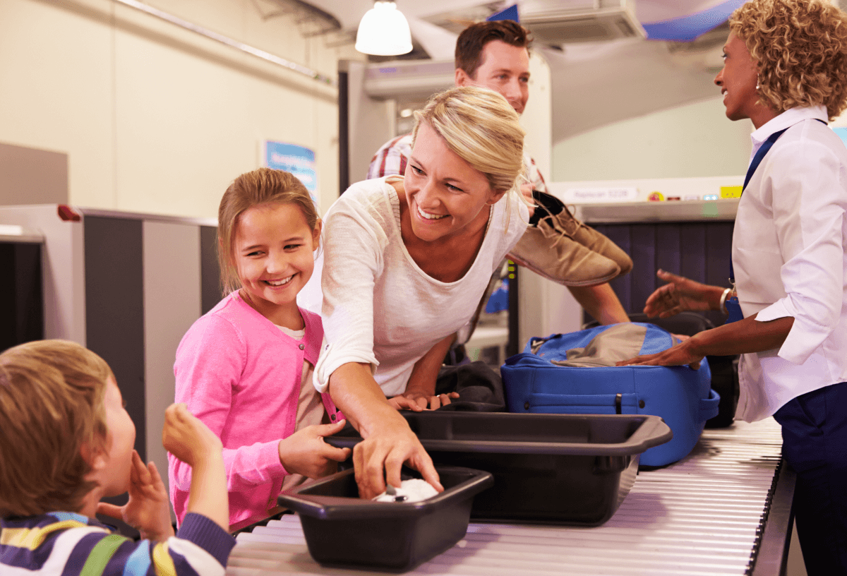 One person has full responsibility for the cases and bags, one person has responsibility for the kids – this way the adults aren’t rushing around trying to do the same job and something gets left behind by accident, although it would be a pretty peaceful flight with the little ones left at security…