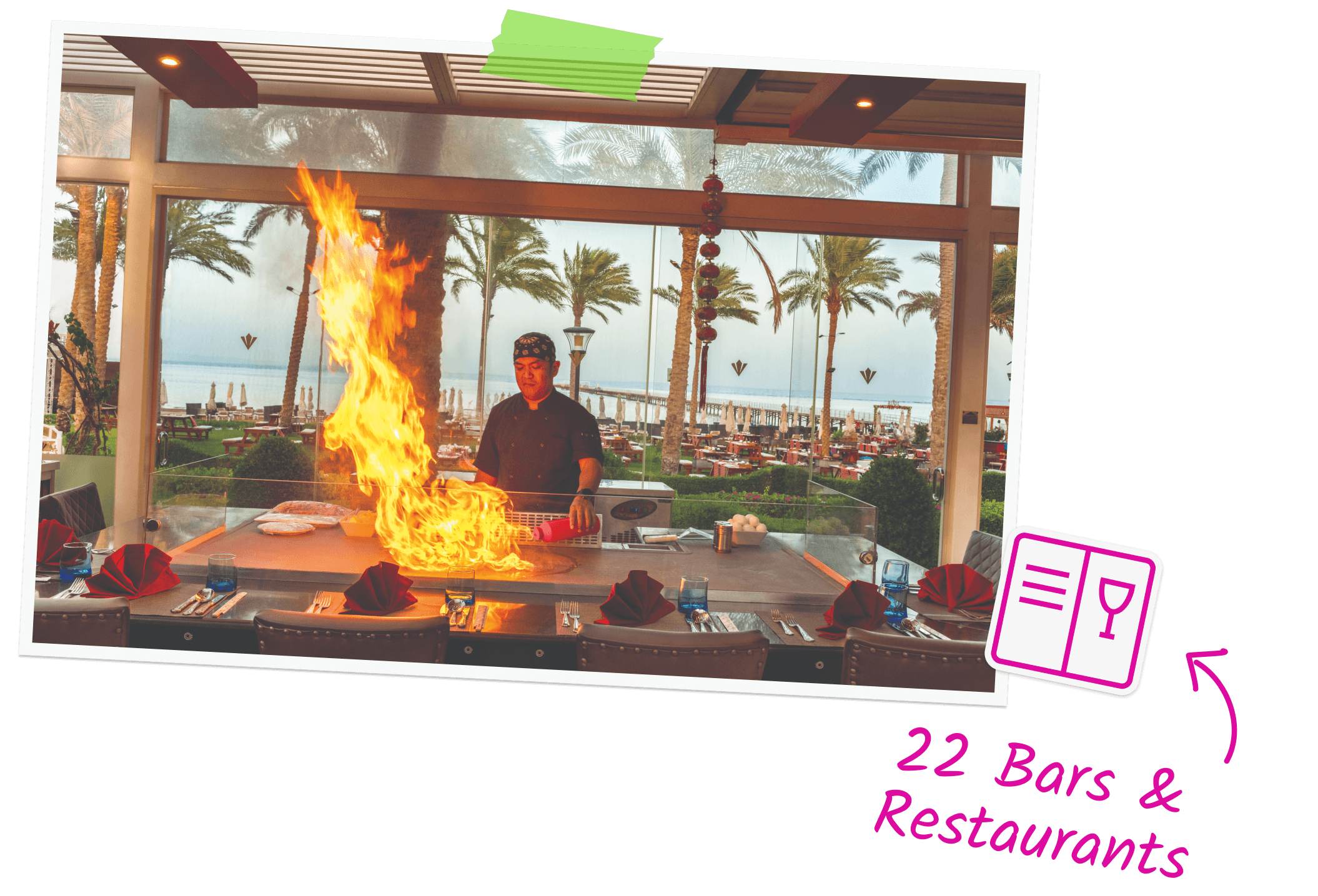Don’t want to leave your sun lounger? You don’t have to. The resort has multiple snack bars and beach kiosks offering freshly made shawarma, burgers, crepes, salads, and more – perfect for grabbing something tasty between dips in the pool.