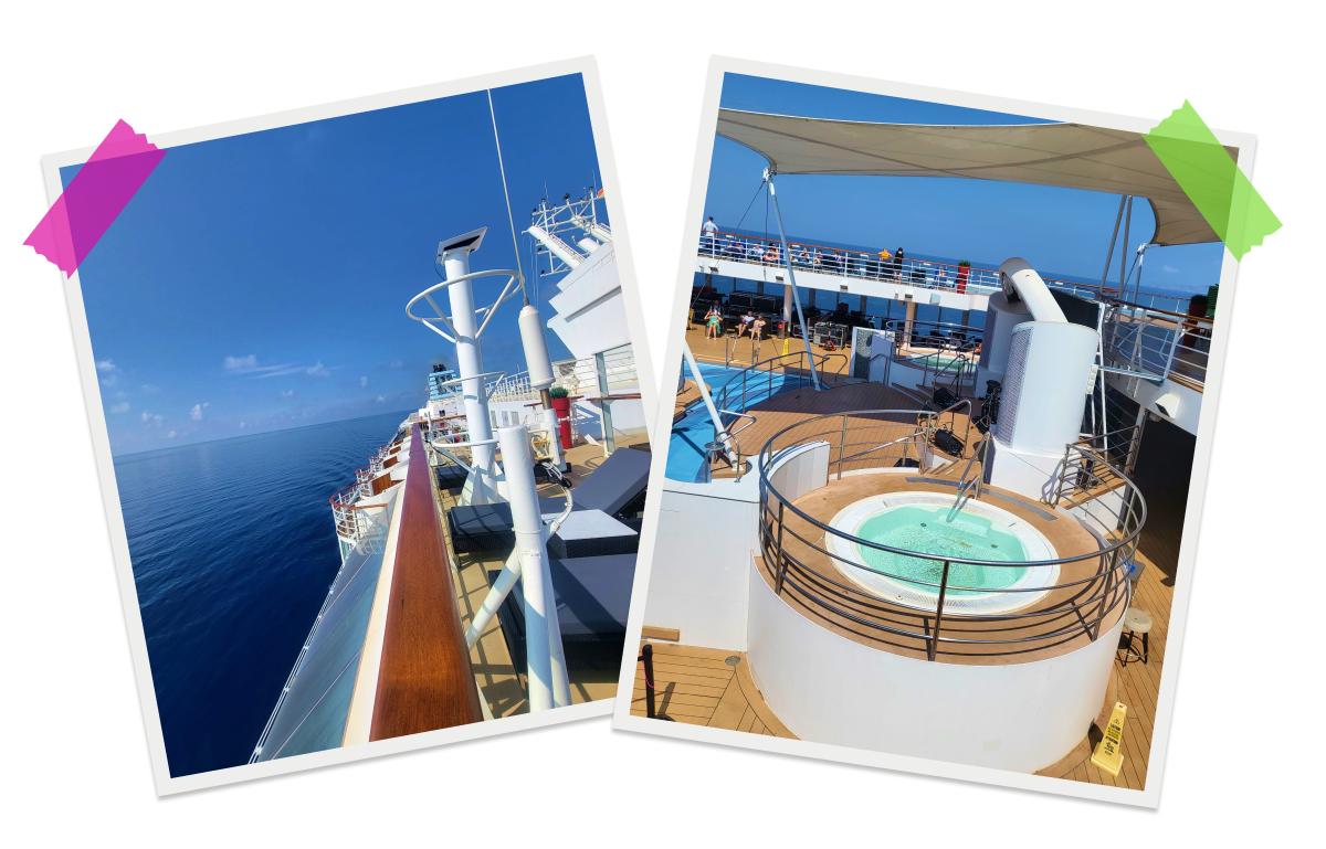 After wandering up to the highest point of the ship on Deck 14, we discovered the perfect spot to do a bit of sunbathing. Luxurious, plump sunbeds were lined up facing out to sea, making the perfect area to top up our tans whilst soaking in sea views. It would’ve been rude not to!