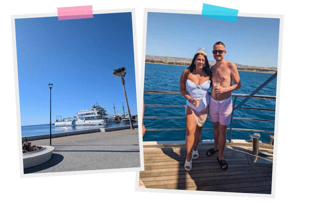 One of the absolute highlights of the trip was our Ocean Vision half-day boat cruise from Paphos Harbour. Around 40 of us climbed aboard for a few hours of sunshine, swimming, drinks, and dancing — it was such a laugh! The crew were fantastic, and the views of the coastline from the water were breathtaking. Let’s just say it was the perfect warm-up for the wedding celebrations that followed.