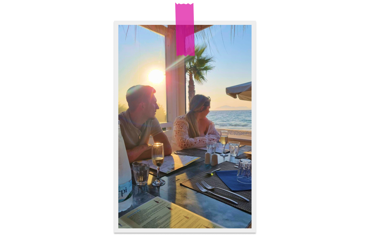 When we arrived at the restaurant, it was more special than we could ever have imagined. We were seated right on the beach in a beautiful al fresco setting, and the hotel had tied balloons to our table and chairs. We were then given a complimentary bottle of champagne to help celebrate, and it was lovely to clink our glasses as the sun was setting on the beach.