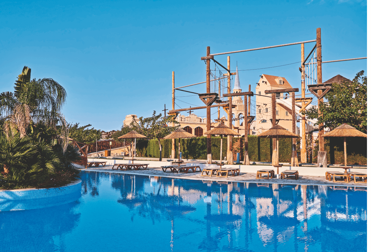 The setting of this hotel is picture-perfect – it’s right on a sweeping beach looking out to dramatic mountain views. When it comes to activities, all ground is covered. The kids can join amazing kids’ clubs, go to swimming lessons, have a competitive round of mini golf or cool down on a waterslide. There are lots of shallow pools dotted around as well as larger ones for big kids and adults, so all the family will find a spot they love.