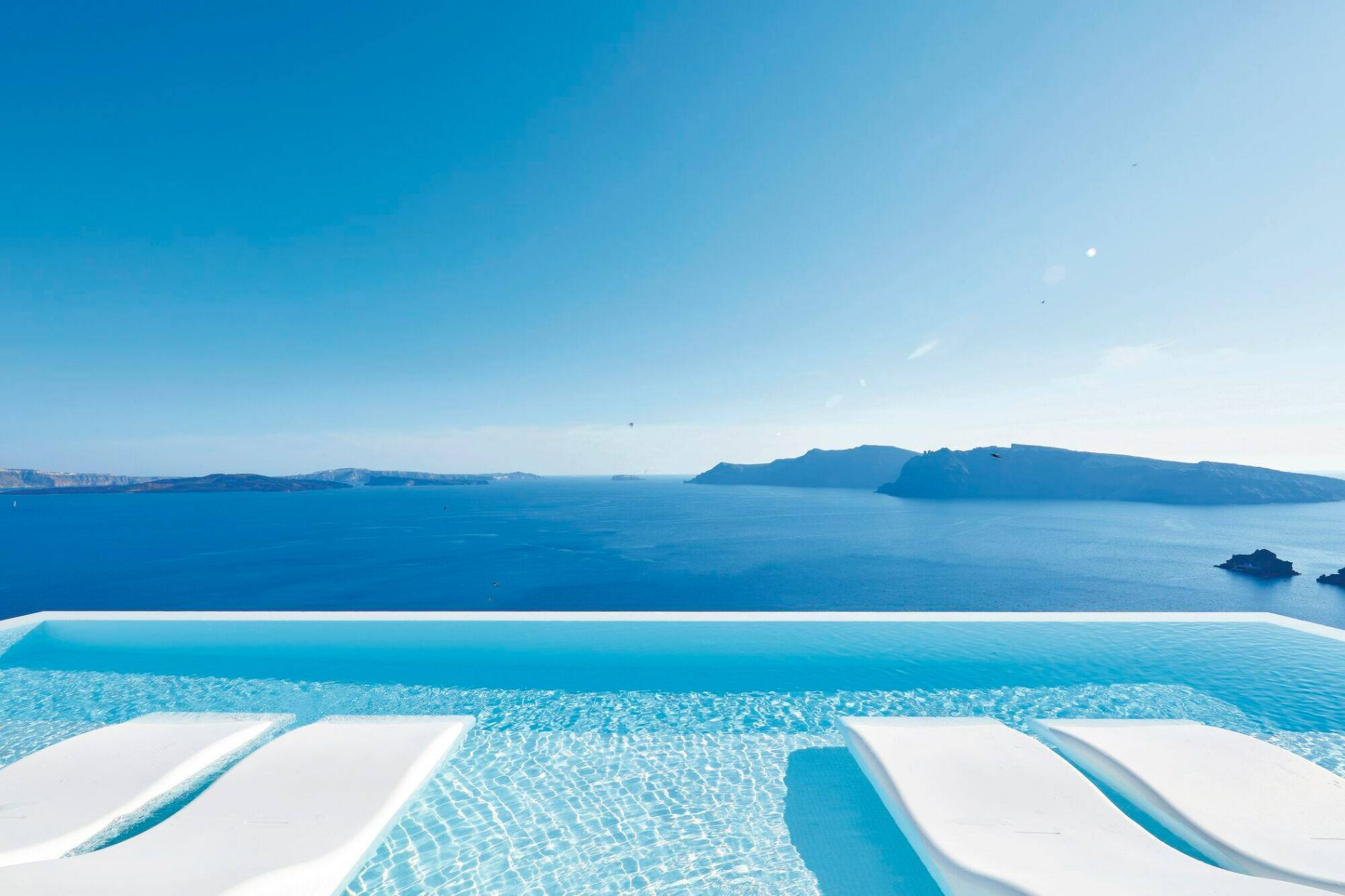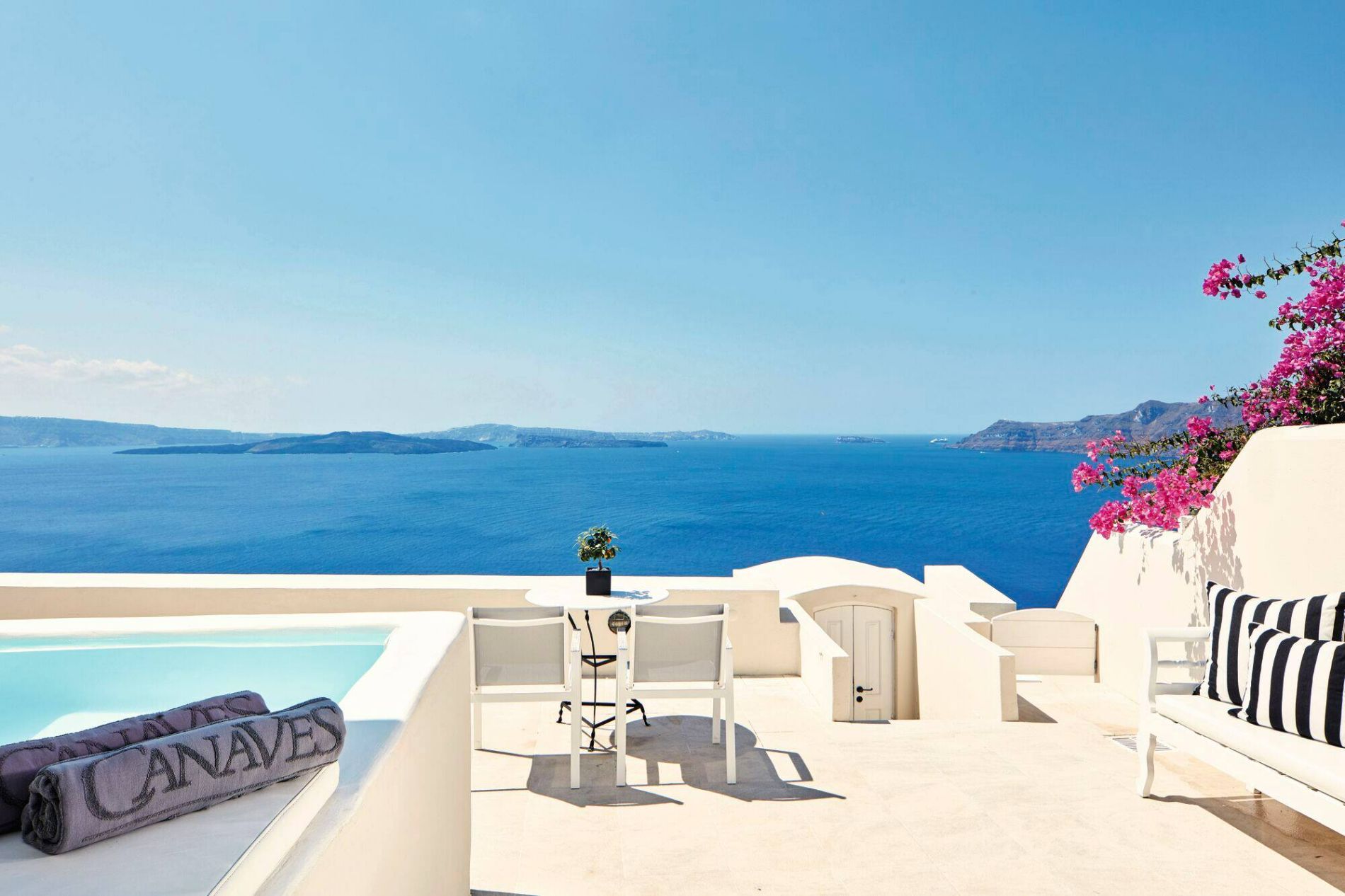 We’ve all seen the pictures – bright white buildings rolling down a cliffside with blue domes dotted throughout the landscape. You will find this beautiful sight in Oia, Santorini! For the perfect Instagrammable hotel, Canaves Oia Suites is the place to be.