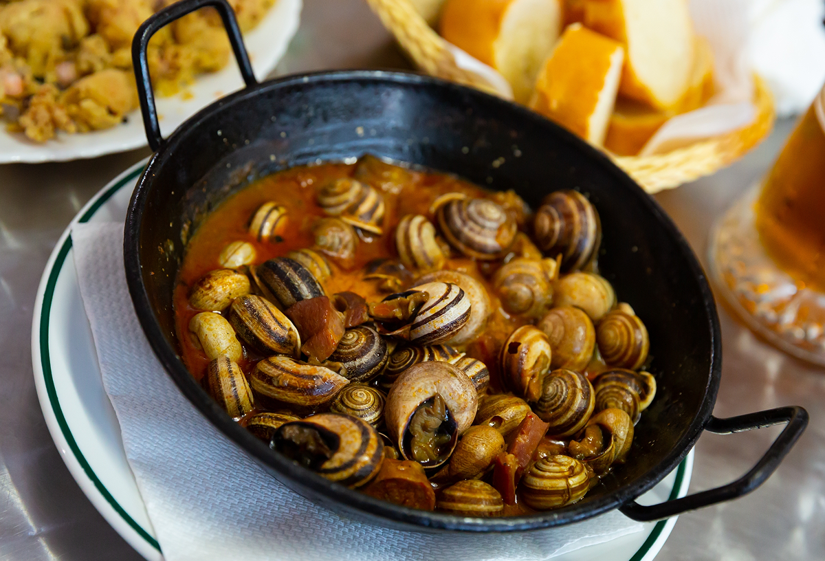 • Snails cooked with tomatoes, peppers, onion, garlic and sometimes chorizo, stewed in a warming homemade gravy