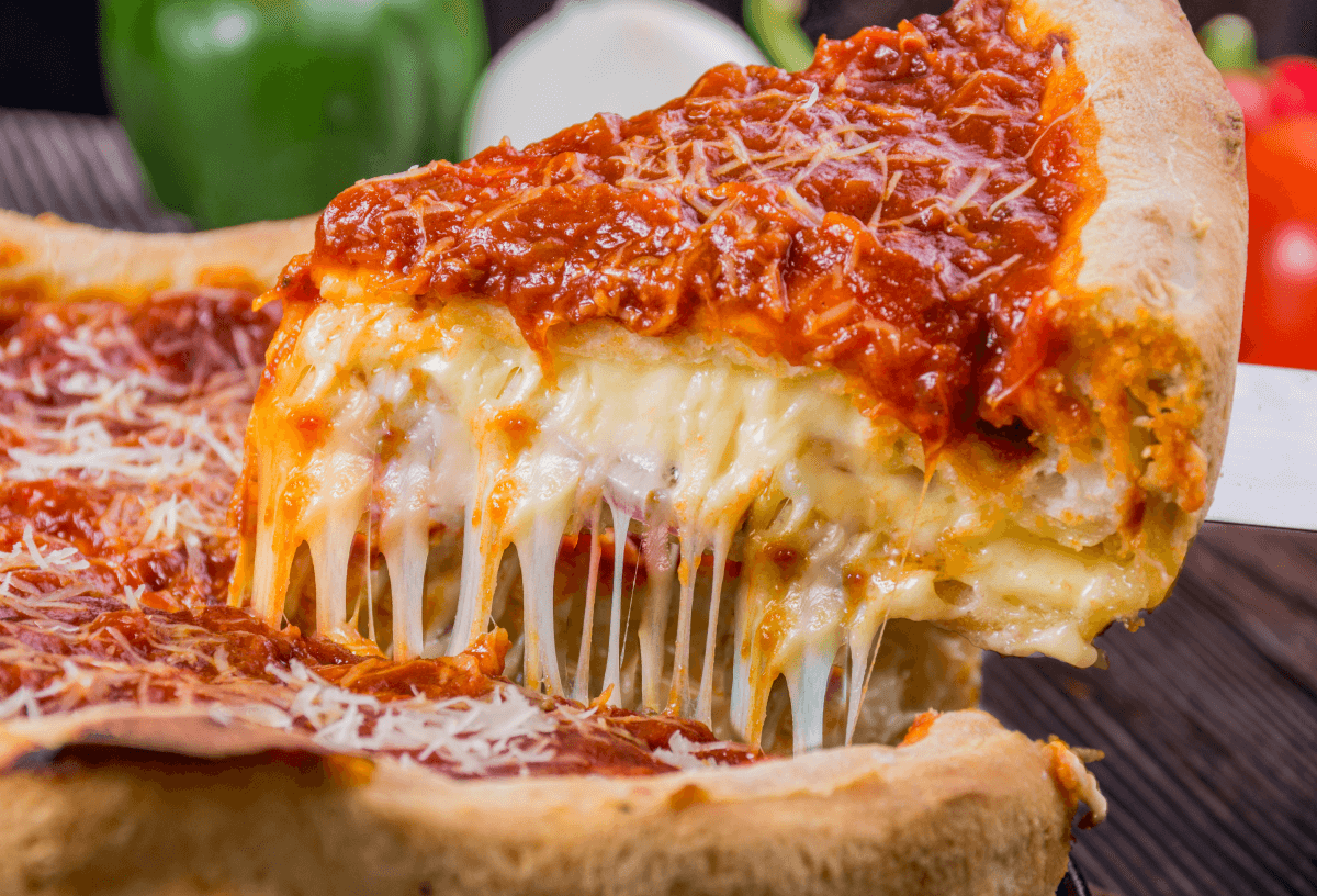 Chicago deep-dish pizza, also called Chicago-style pizza, is pizza cooked in a pan instead of a baking tray or pizza peel. Due to it being cooked in a pan, diners enjoy a huge layered delight that rivals typical pizza in sheer height alone. It is usually stuffed with mozzarella cheese and sausage, with each restaurant putting its own spin on the crust and the spiciness of the sausage.